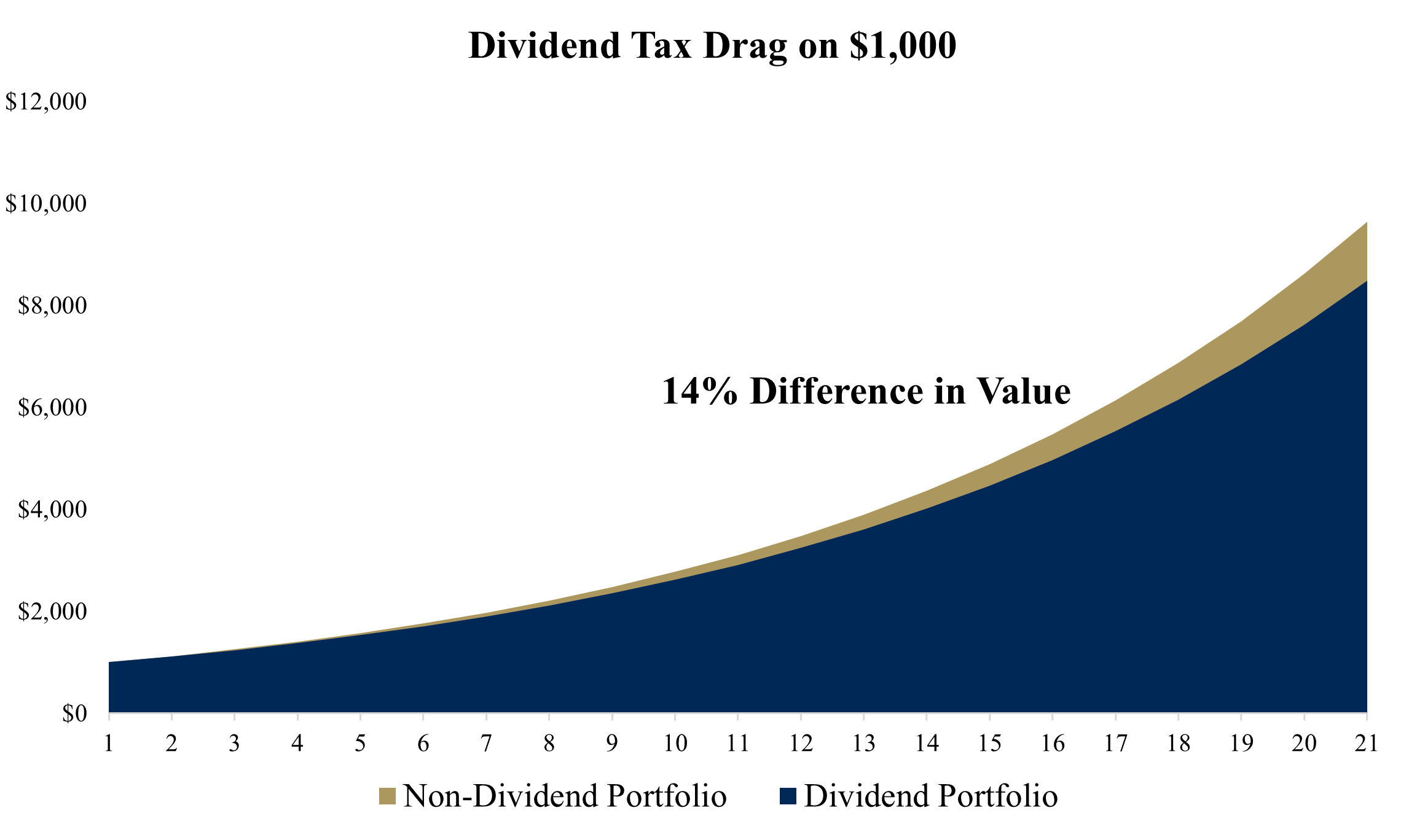 Taxes, one of life’s certainties, are never far away, and with dividends, they are always close at hand. Even when considered “qualified” (paid out by US companies) and taxed at a roughly 20% rate, dividends represent a forced tax event when held in non-retirement accounts. Namely, a dividend is a partial forced liquidation of a portion of your wealth that is taxed immediately. In contrast, price appreciation allows you to control when you sell and thus when you pay, which facilitates greater uninterrupted compounding of your wealth.